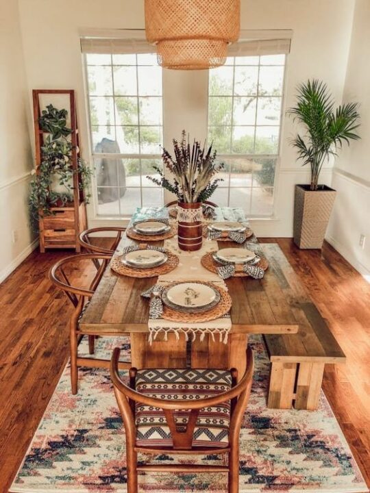 The table in a Bohemian dining table with bench set can be made of a variety of materials, such as natural wood, rattan, or iron, and it can have a rustic or distressed finish. The bench that comes with the set can be upholstered in a colorful and textured fabric or have a natural woven design.