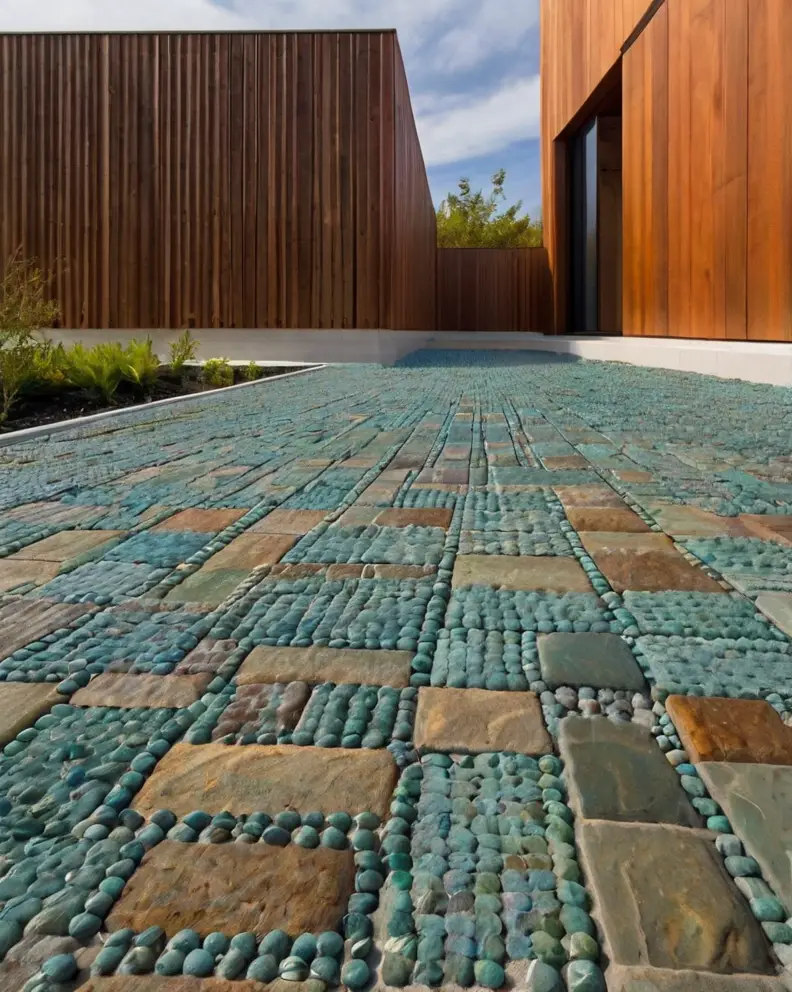 A mosaic tile driveway is an artistic and eye-catching option that combines functionality with creative expression. This unique and visually striking driveway features the use of mosaic tiles to create intricate and colorful patterns or designs, often integrated with permeable materials like gravel or moss to provide a combination of aesthetics and water drainage.