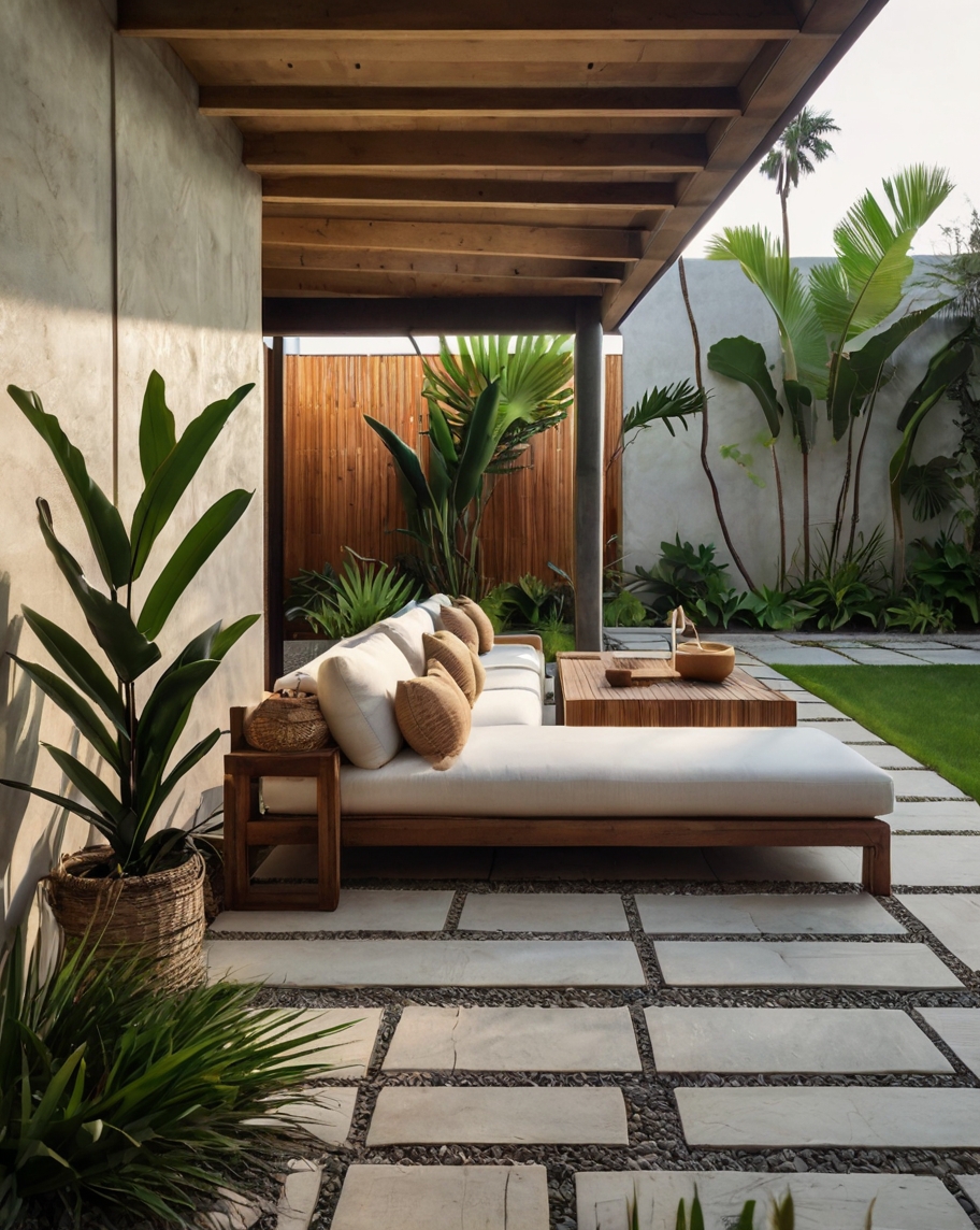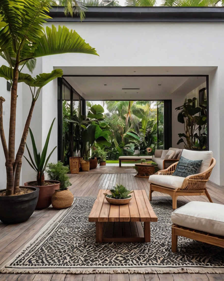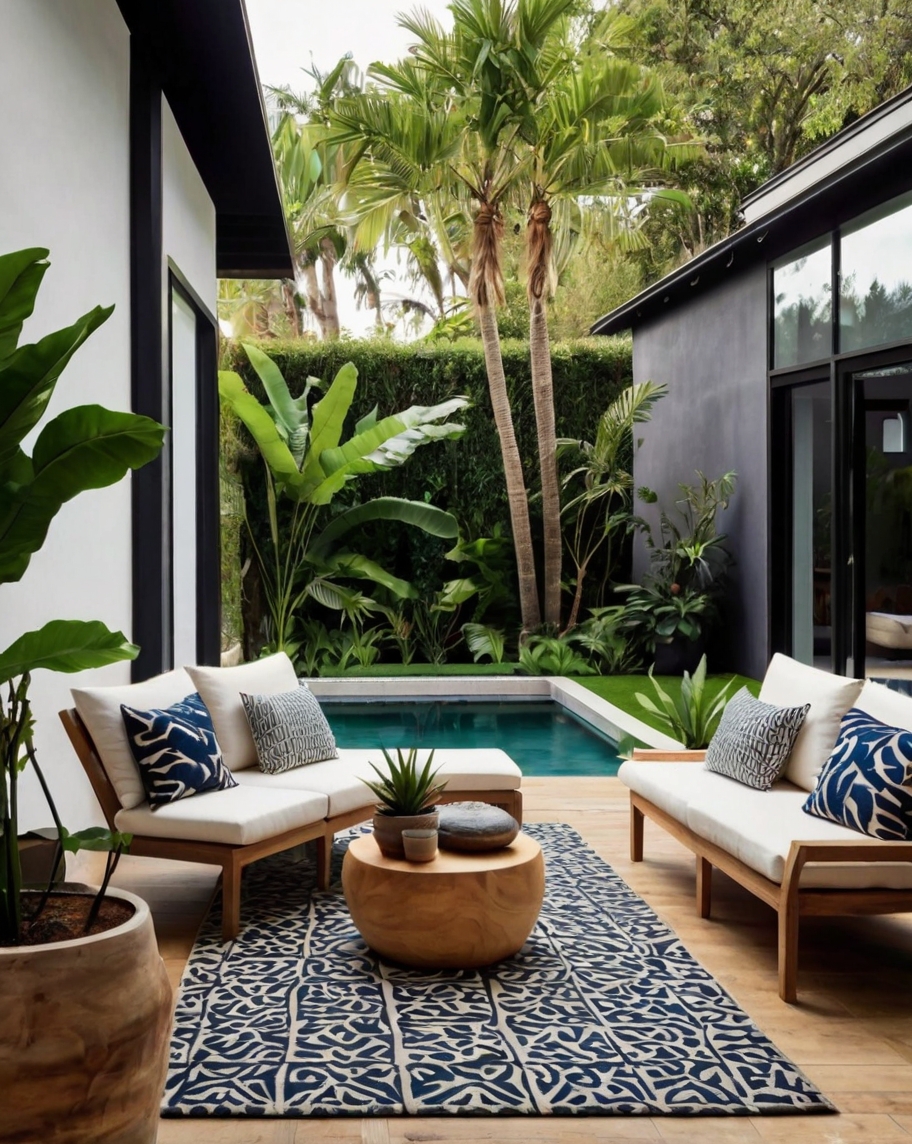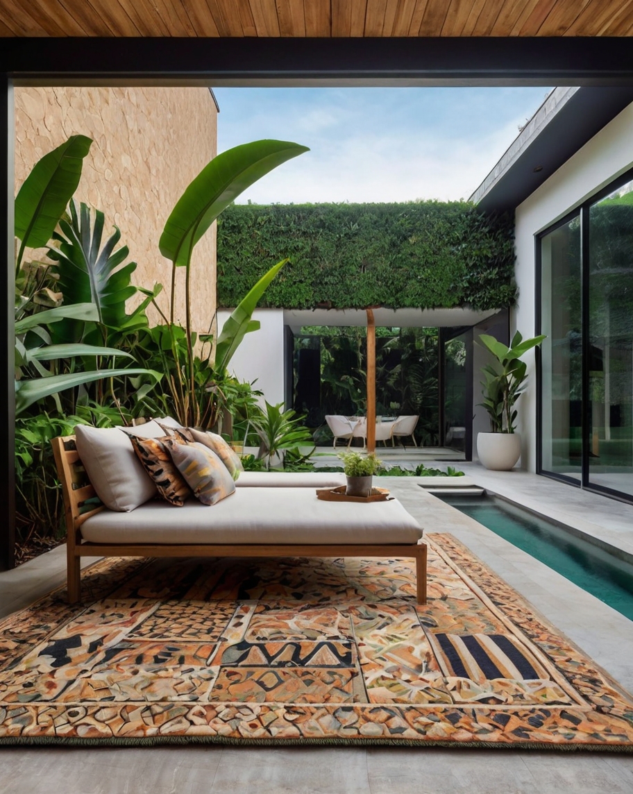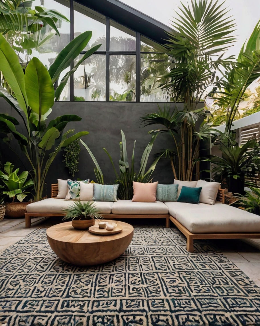 Outdoor Rugs and Cushions: Opt for patterns and colors that complement the tropical theme.