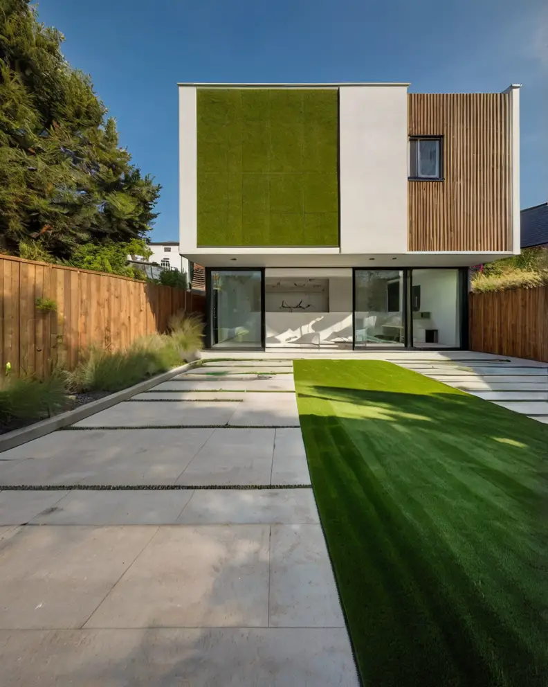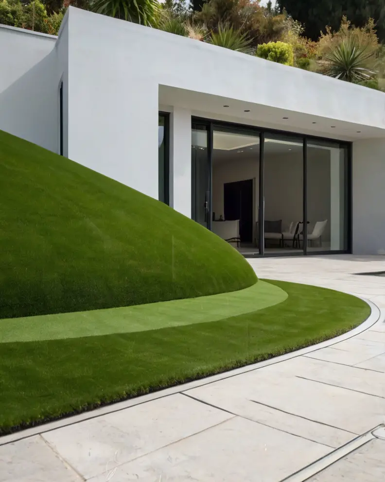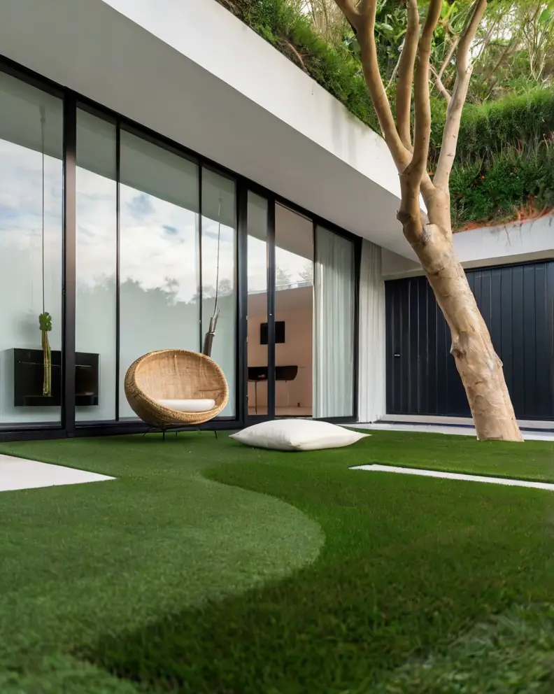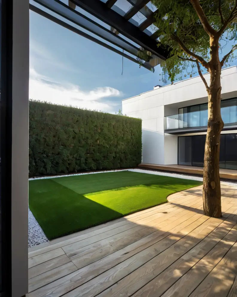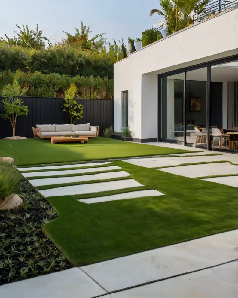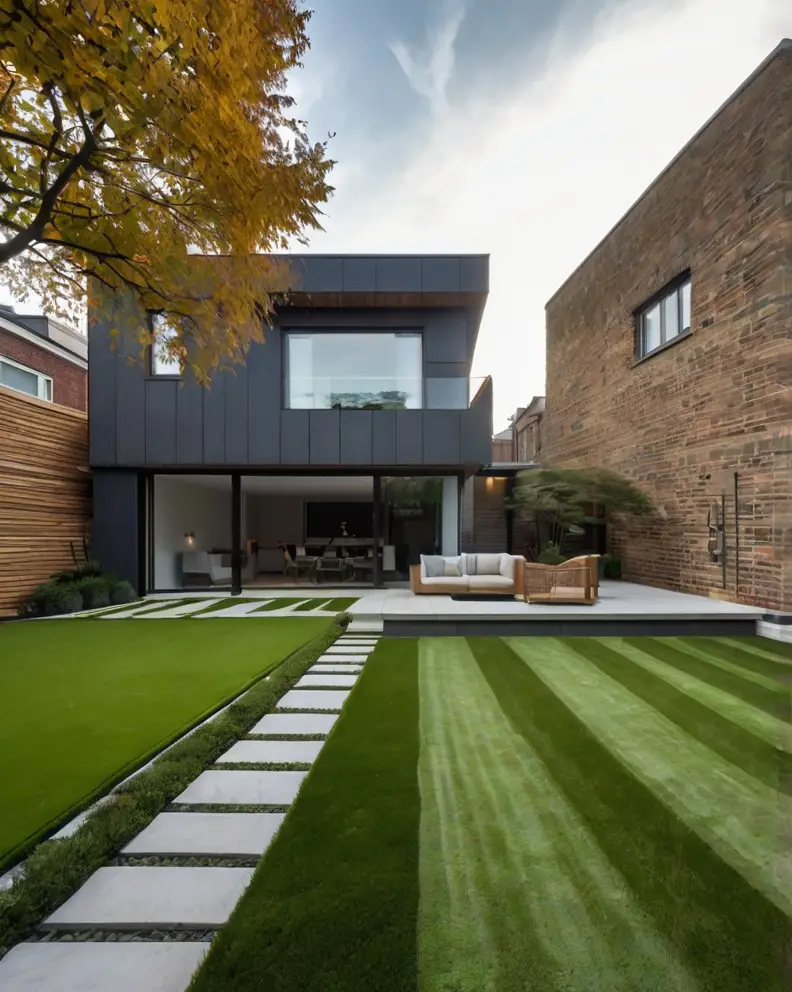 A traditional lawn look can be achieved using high-quality artificial grass that mimics the lushness and softness of real grass.