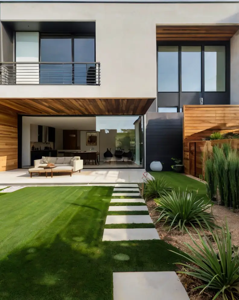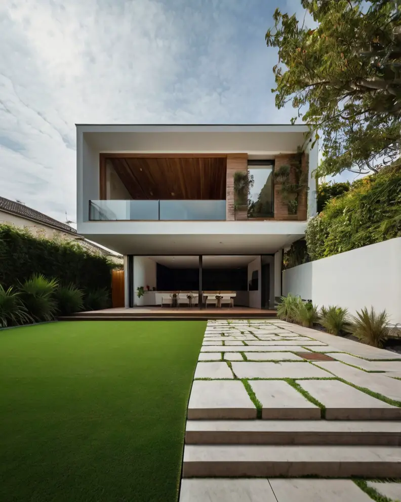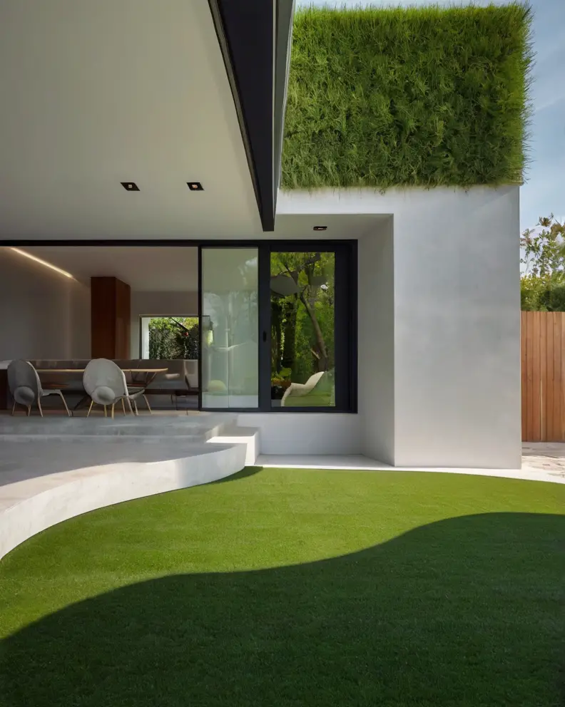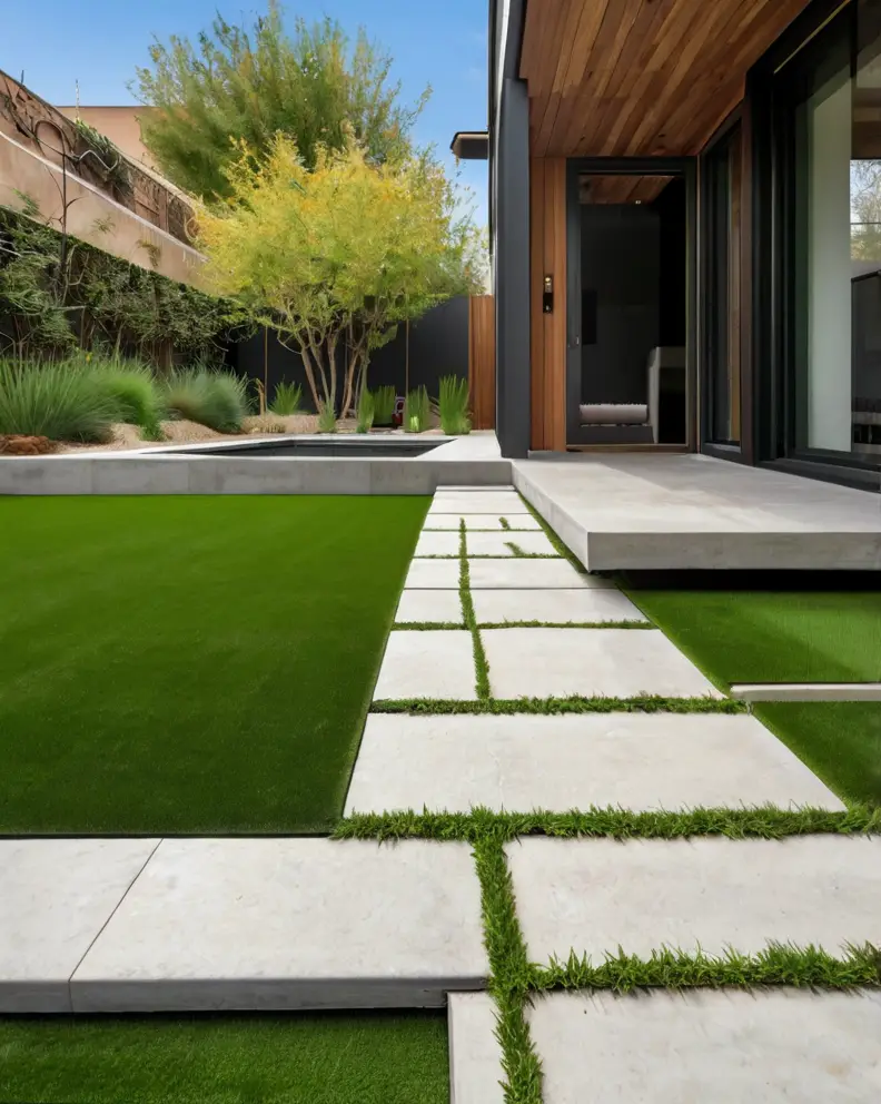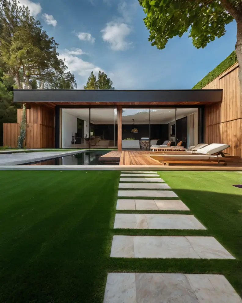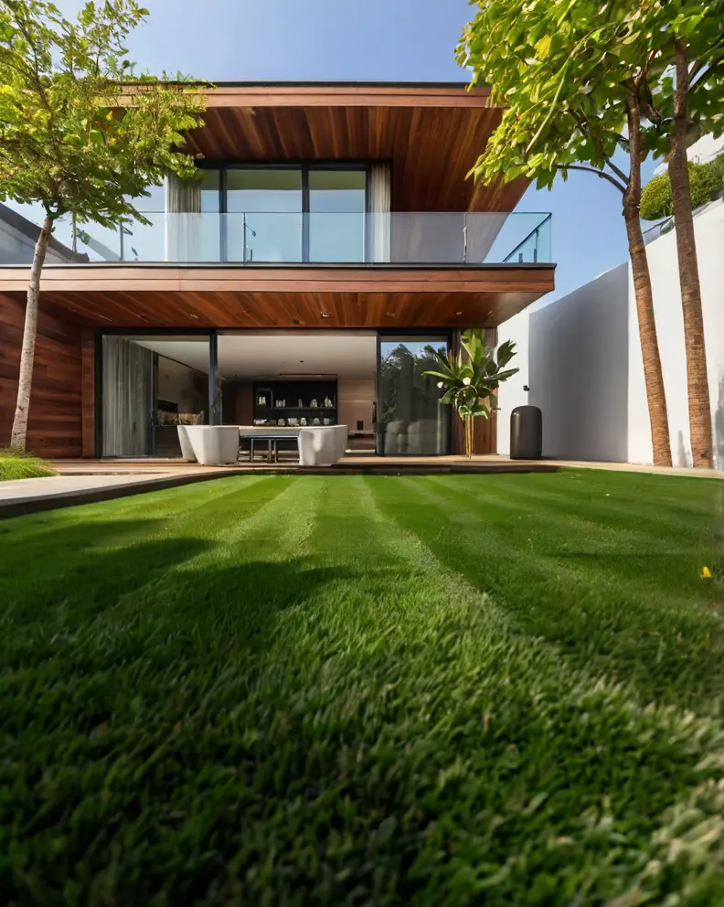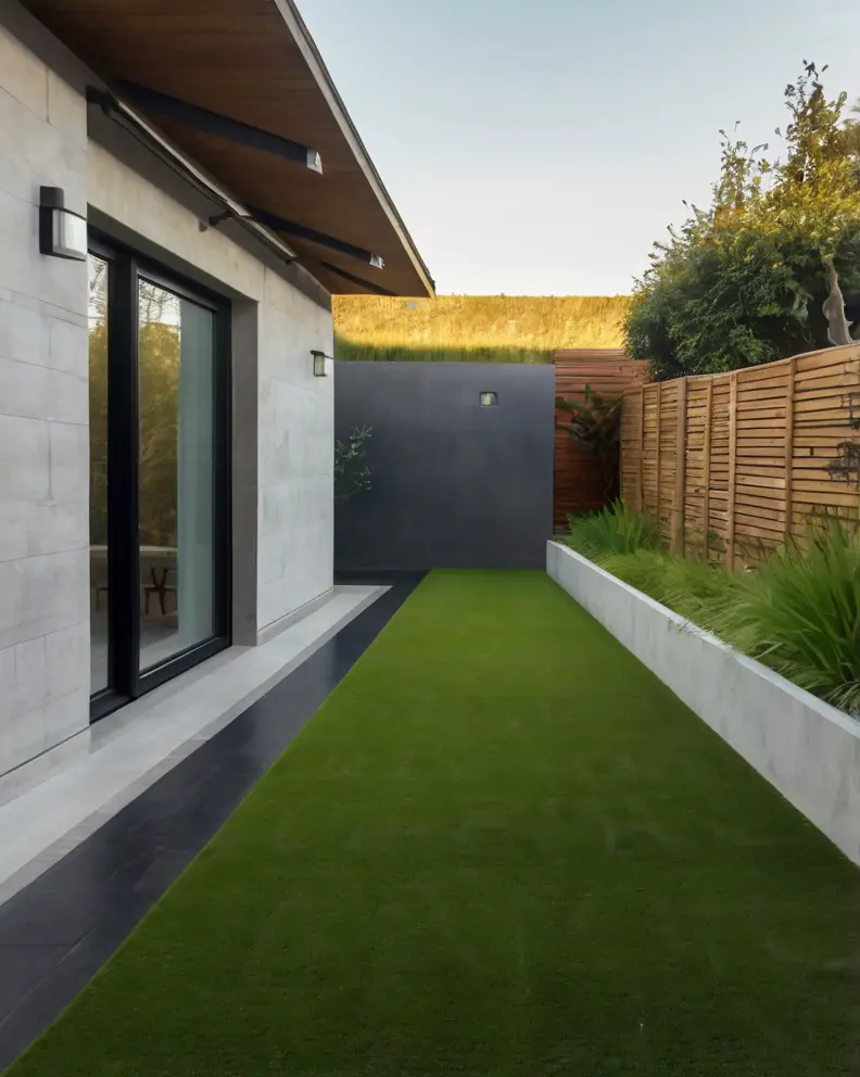 A traditional lawn look can be achieved using high-quality artificial grass that mimics the lushness and softness of real grass.