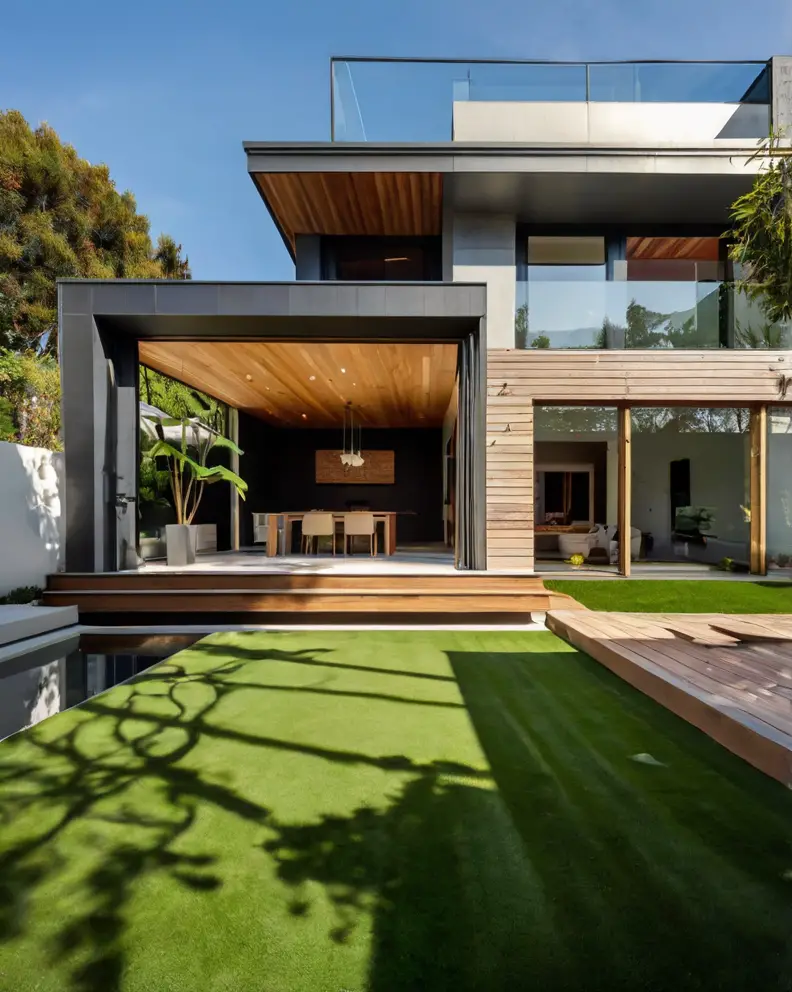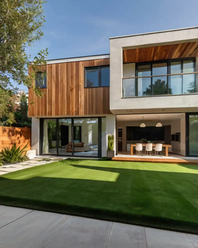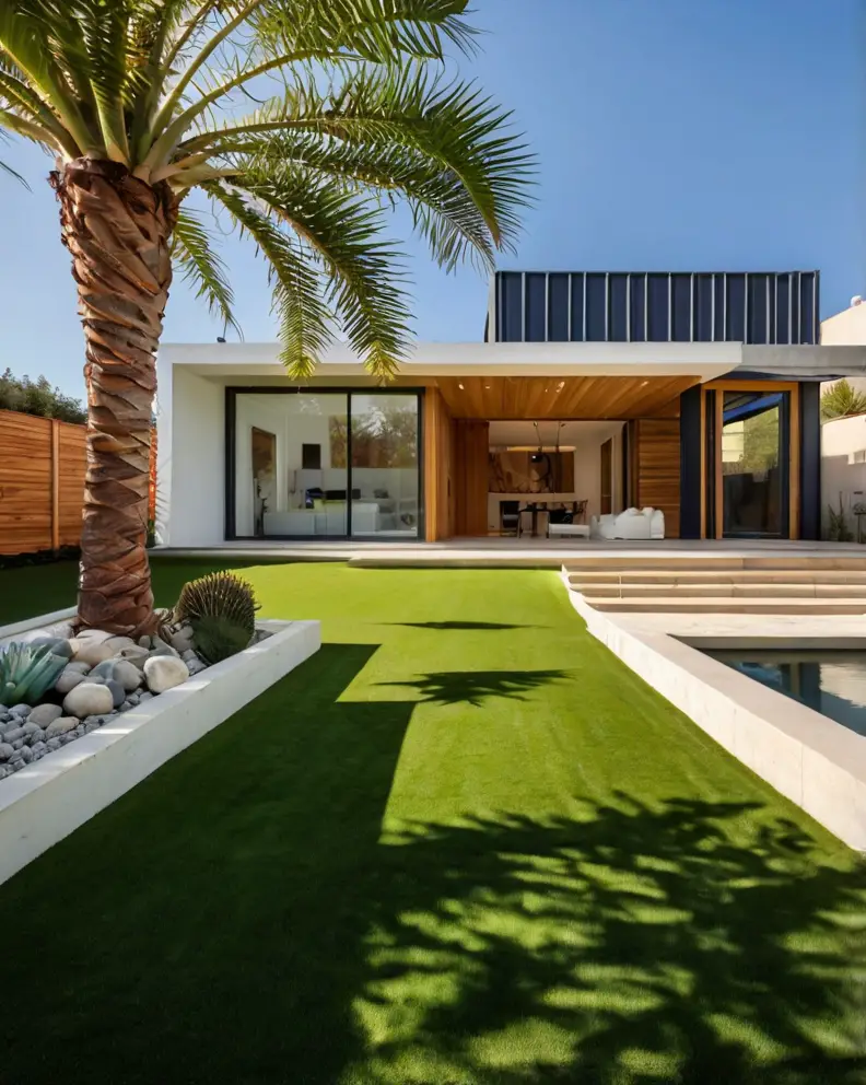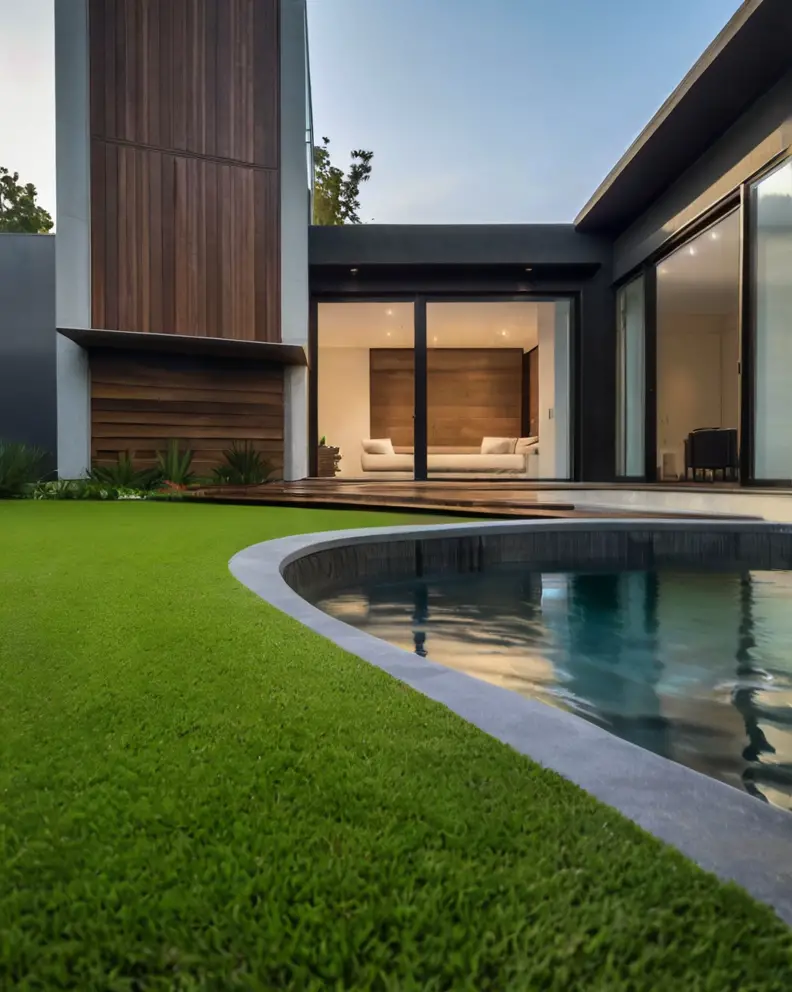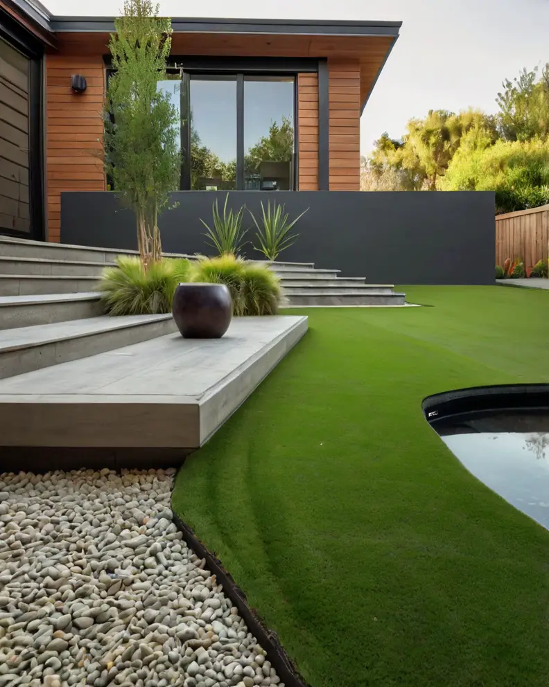 Blend artificial grass with natural elements such as stone, wood, and plants. Create a layered look by incorporating raised garden beds, rock gardens, or wooden decks.