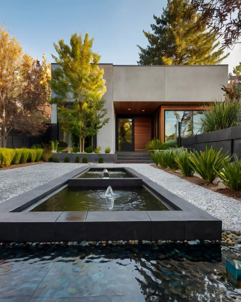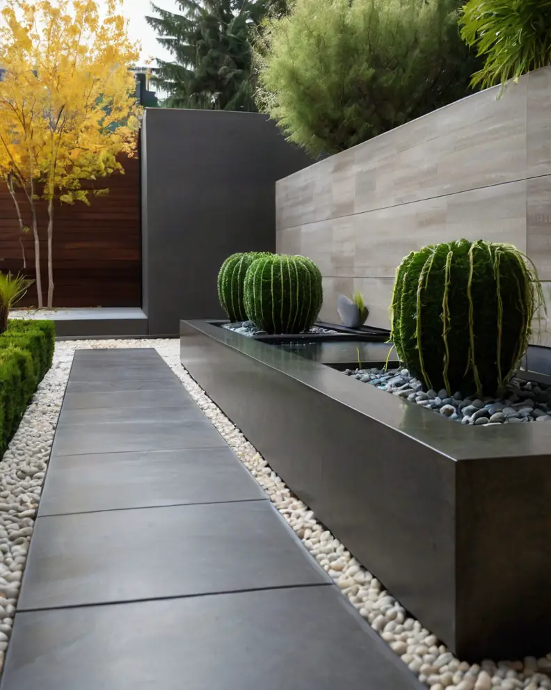 - Features: Decorative planters, sculptural elements, or low-maintenance water features like a simple fountain.