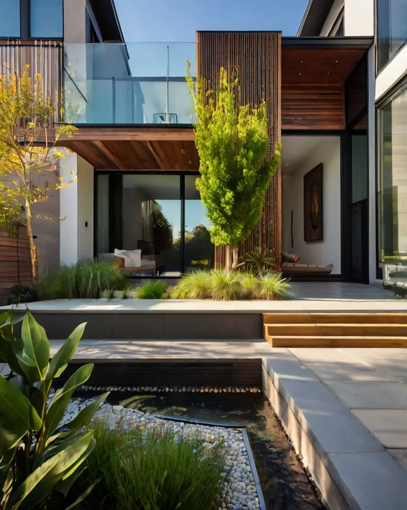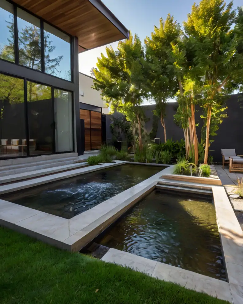 Think about incorporating a narrow, linear water fountain or a reflecting pool with smooth surfaces and clean edges. These minimalist water features create a soothing ambiance without overwhelming the space.