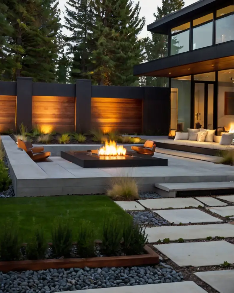 A modern fire pit can serve as a focal point, often designed with sleek materials like concrete, steel, or stone.