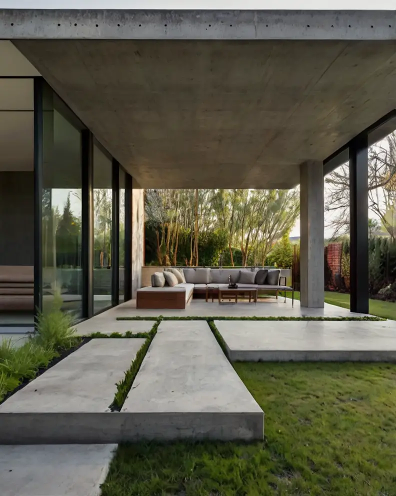 Use neutral tones for patios and walls, such as grey, white, or beige, and balance them with pops of green from well-chosen plants.
