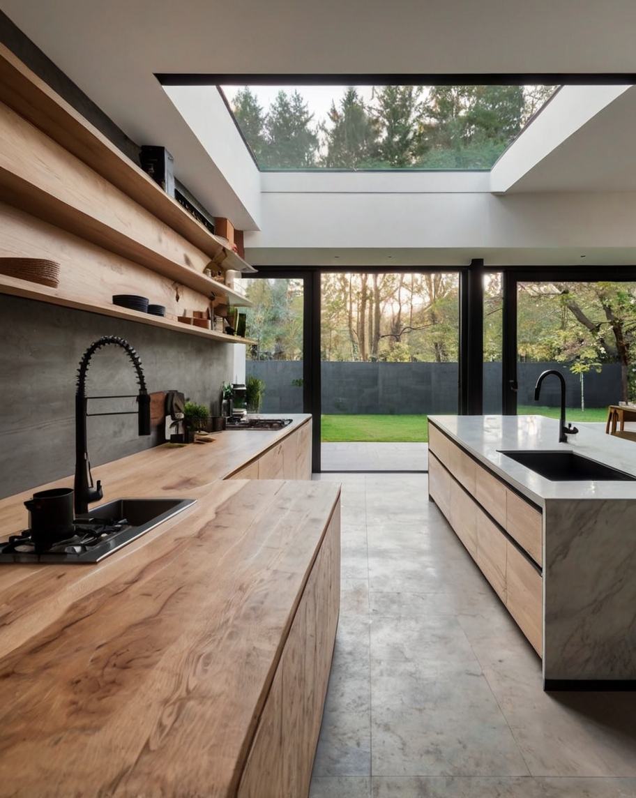 Use a combination of drawers, cabinets, and open shelving to maximize storage. Vertical storage solutions, such as tall cabinets and wall-mounted racks, can help to keep countertops clear.